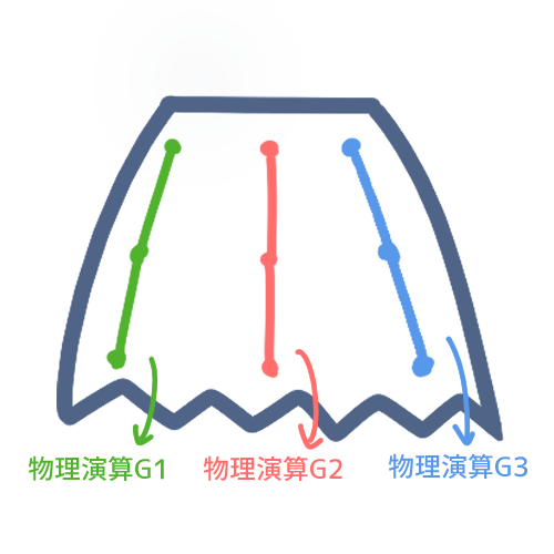 スカートの揺れに3つの物理演算G(グループ)【スカート左揺れ】【スカート中央揺れ】【スカート右揺れ】を作成し、その部位ごとに対応したパラメータ、揺れを作っています。(上のポストの40秒~60秒付近)