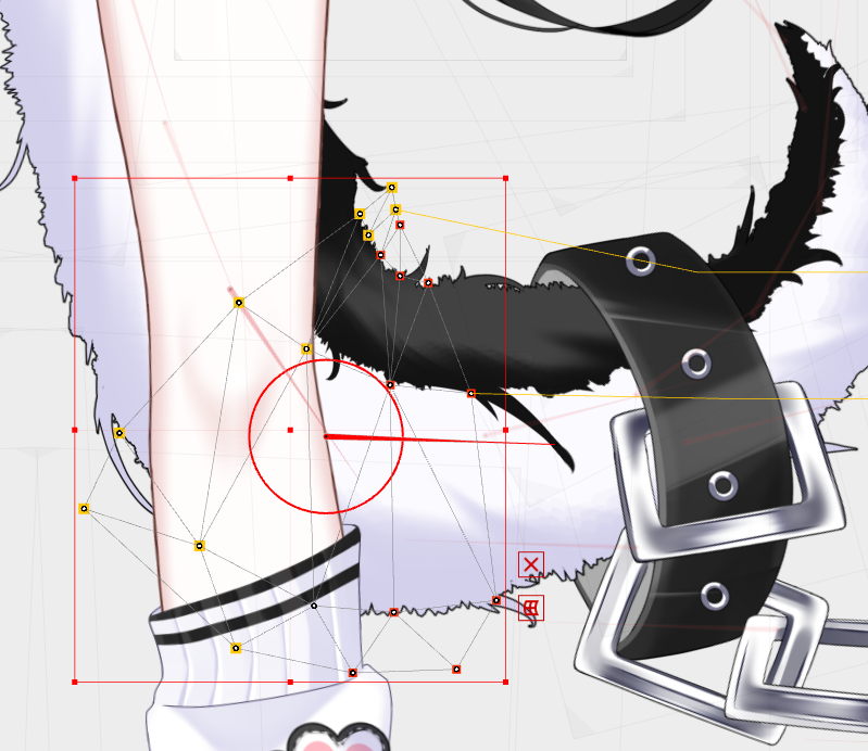 メッシュ割りがうまくいっていると自動でバインドしてくれます。ですが、パッと出しだと回転デフォーマを動かしたときにメッシュが萎んでしまうので、メッシュにもパラメータを設定して曲げたときに1点1点萎まないようにしています。かなり根気のいる地道な工程です。
