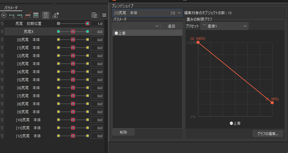 上着を着ていないときは100%動く、上着を着ているときはxx%の動きをする…というような設定を[ブレンドシェイプの重みの制限設定]で行っています。