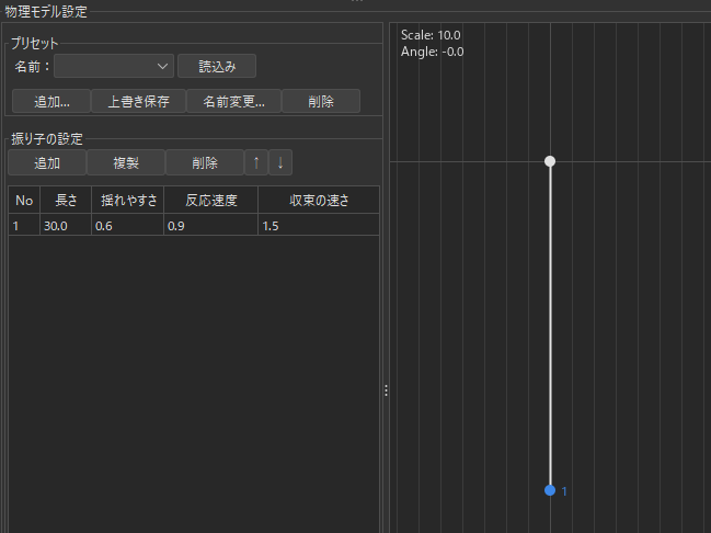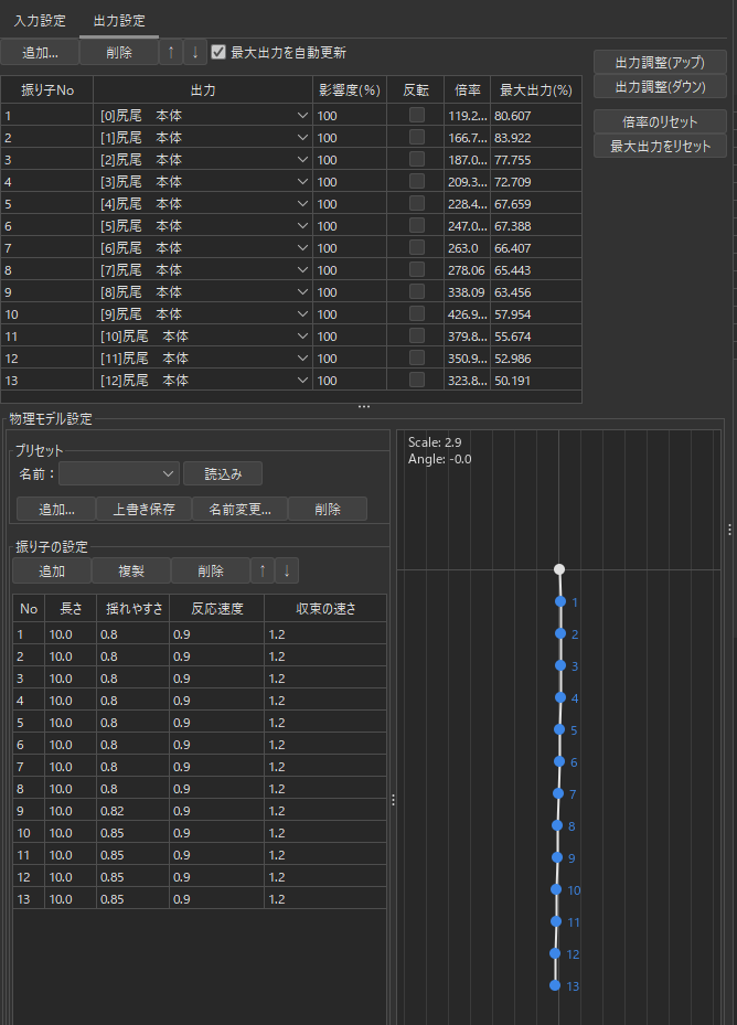 【揺れやすさ】は0.8前後にし、【反応速度】と【収束の早さ】を調整すると柔らかさが変わって良さそうです。