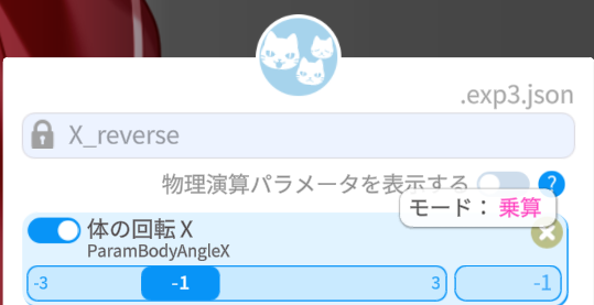 更に、このように入力を分けておけばVtubeStudioの表情ファイル作成で、モードを[乗算]、値を[-1]の表情ファイルを作ればいわゆる「Xの反転」「Yの反転」が簡単にできます。おすすめです。