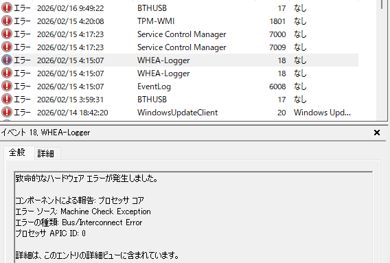 で確認するとWHEA-Logger 18 でCPUが原因で落ちてることが分かる。プロセッサIDは0や11、13だったりする。0が多い。